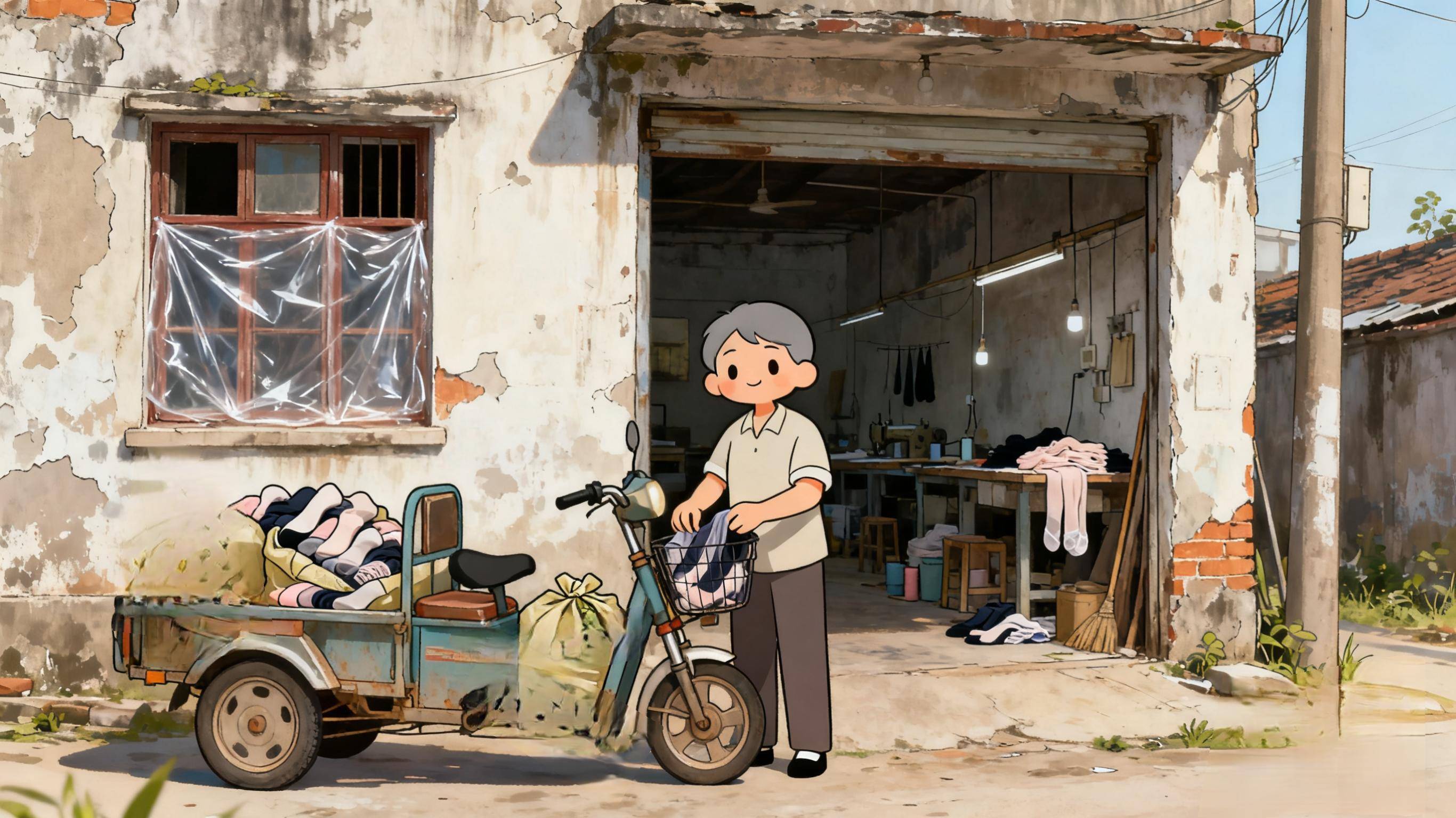 屋里光线很暗,靠墙的一侧摆放着四台老旧的织袜机,机器发出“咣当咣当”的声音,震的地面都要微微发颤,几个穿着破旧围裙的妇女低着头,双手飞快的在机器面前来回操作着,一张张脸上满是疲惫不堪,额上的汗珠顺着脸颊躺下来却没时间擦。